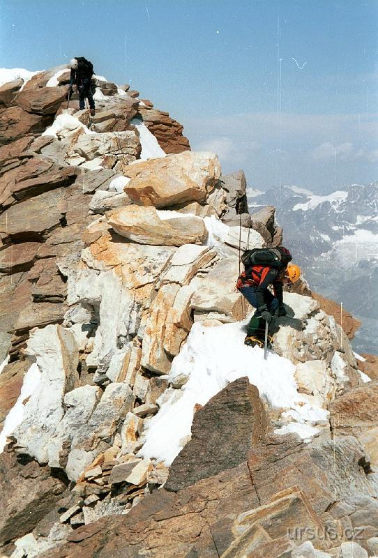 Postup mixovým terénem vrcholového hřebínku byl dosti zdlouhavý. V mačkách se po kamenech chodí dosti špatně, zvlášť když je z každé strany 500m propast:-)