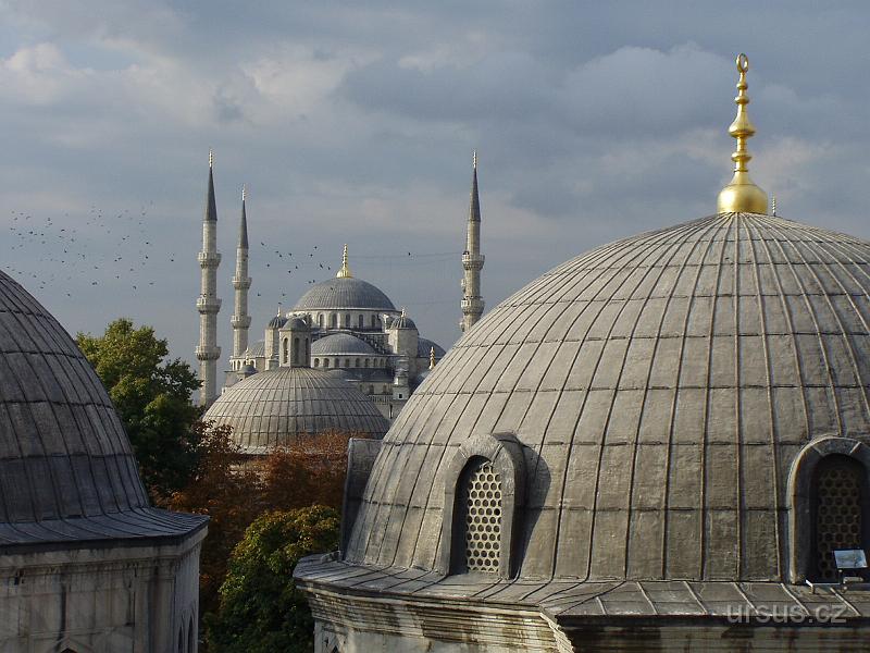 Istanbul:pohled z chrámu Hagia Sofia k Ahmedově mešitě