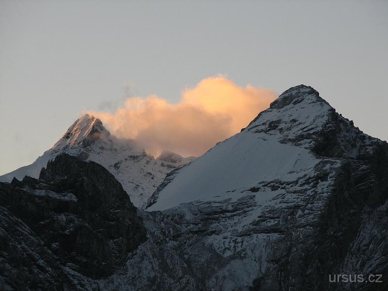Ranní pohled ze sedla Passo di Stelvio (2757m) na překrásný Grand Zebru (3851m) vlevo a další, mě neznámý, ale taky krásný kopec vpravo