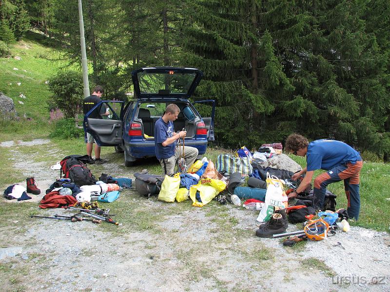 Ve vesnici St. Jacques přebalujeme věci před výstupem k prvnímu bivaku
