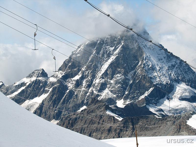 Pohled z Rollinu na majestátný a jako obvykle velmi cudný, zahalený Matterhorn skrz všudypřítomné lanovky (především na švýcarské straně Alp)