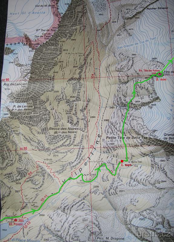 | Trasa našeho dalšího postupu. Když nevyšel Matterhorn, rozhodli jsme se pro náhradní variantu, alespoň se přiblížit k Dent de Herens. Auto jsme nechali u hráze přehrady Lago di Place Moulin a dál šli pěšky. Asi 5 kiláků kolem přehrady, moc pěkná vycházka a pak už nahoru. Poměrně brzy jsme zatměli a proto jsme si vybudovali provizorní "přístřešek" v jedné staré rozbité stáji pro dobytek. |