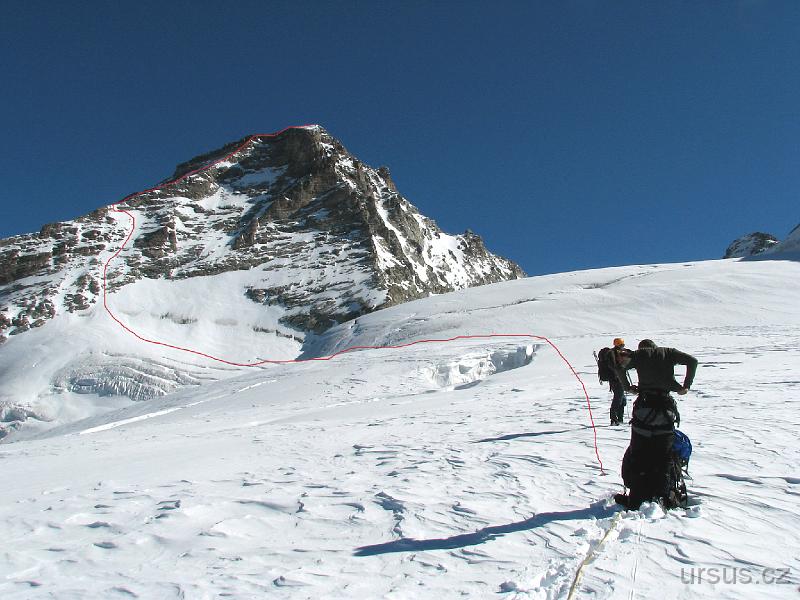 Trasa našeho postupu od bivaku Tête des Roèses na vrchol Dent de Herens