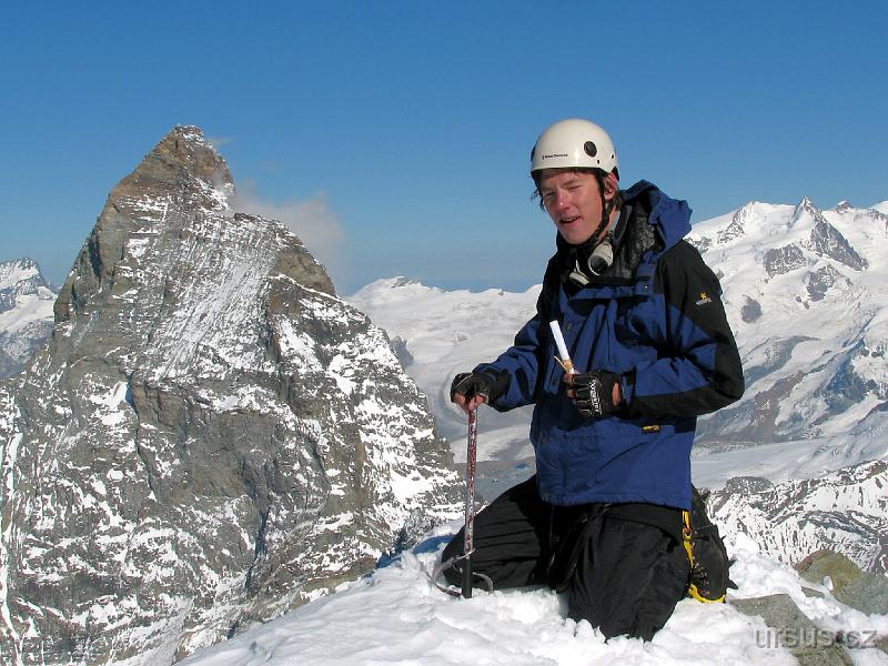 Vlevo Matterhorn, vpravo Monte Rosa. A kdybyste chtěli vědět co že to držím v ruce, tak vám to neřeknu:-) Je to tajemný vzkaz ponechaný na přání tajemné osoby právě na vrcholku Dent de Herens