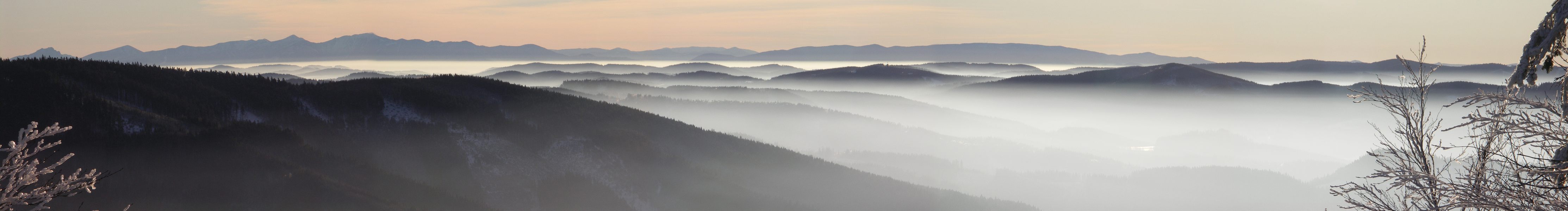 v pozadí Malá Fatra, vpravo Vsetínské vrchy s Vysokou (1024m.n.m.)