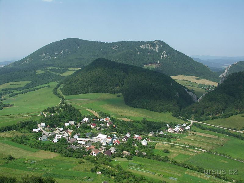 Pohled na malou vesničku Kostolec a stejnojmennou úžinu. V pozadí vystupuje masív Velkého Manína (891 m).