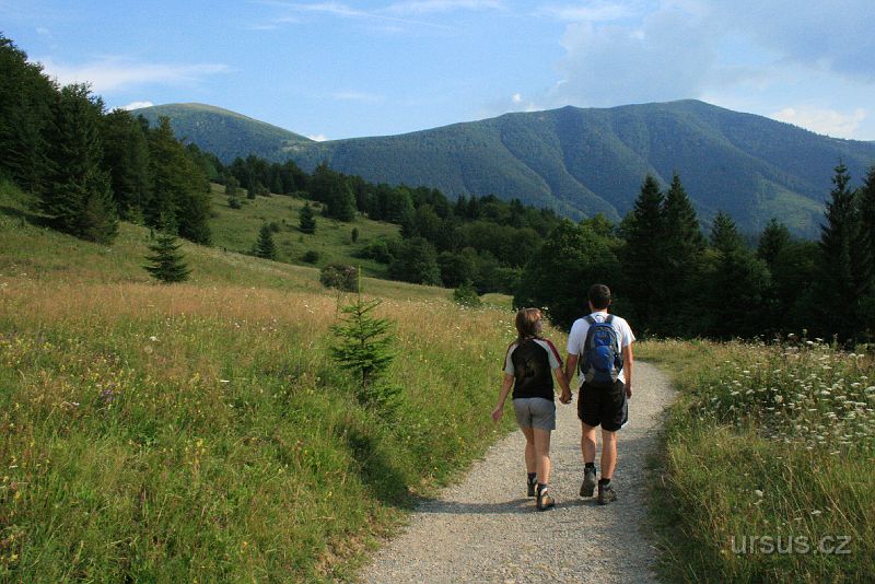 Lukáš a Bára ve večerním sedle Podžiar, na levo je svah Stohu (1607, 4 m.n.m.).