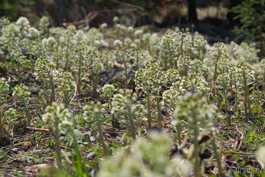 Cestu dolinou Stříbrného potoka lemují lesy devětsilu lékařského (Petasites hybridus)