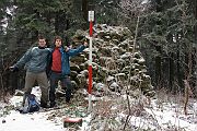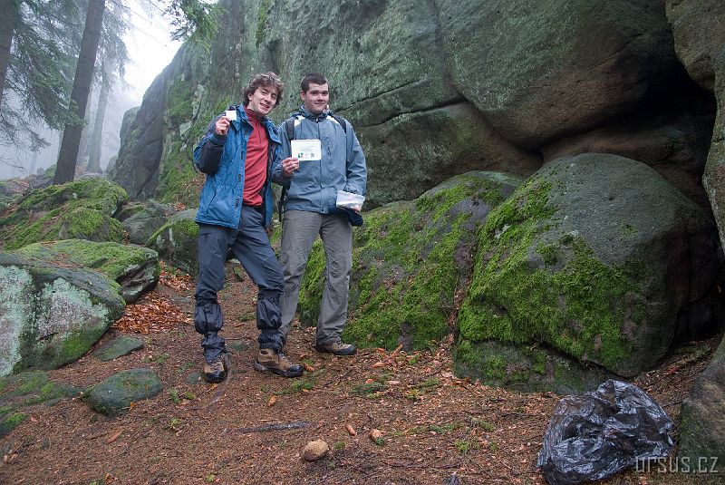 Dnešní vrchol dne- Vsacký Cáb (841m.n.m.) Spokojené výrazy nemáme jen díky tomu, že na samotném vrcholu jsme oba poprvé (nevede sem totiž značka), ale také proto, že nalézáme druhou kešku.