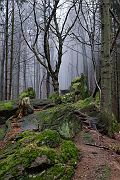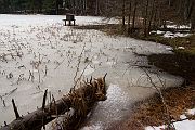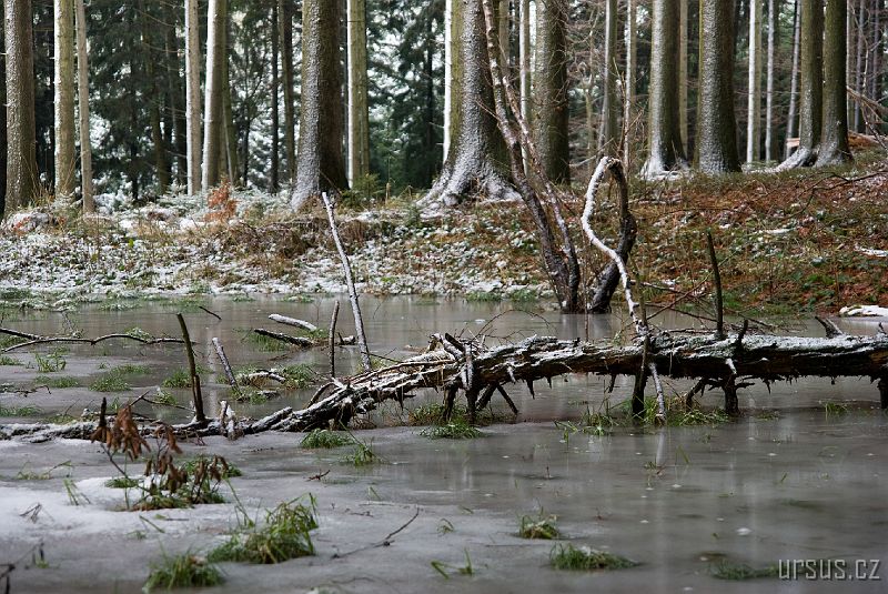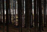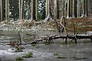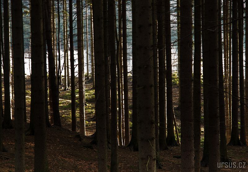Scházíme k Cábskému jezeru a zpod mraků nám vykouklo i slunce, které svým svitem zalilo lesy...