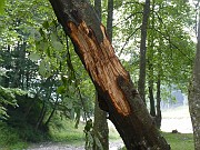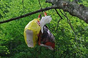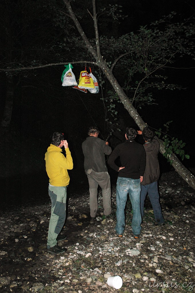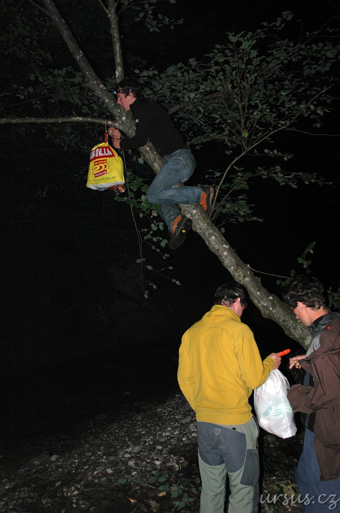 Po návratu do kempu nám Fenek živě vyprávěl, jak s Evčou a později ještě s Aničkou viděli medvěda u místní popelnice. Moc veselo nám z toho nebylo, protože tihle popelnicoví medvědi bývyjí relativně nejnebezpečnější. Jsou moc "ochočení", zvyklí na lidi a tudíž nebojácní a drzí. Takže jsme samozřejmě nic nenechali náhodě a jali se věšet jídlo na strom. A tady začíná malý fotoseriál aneb příběhy medvídka Pů...