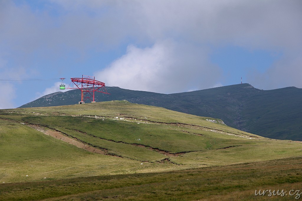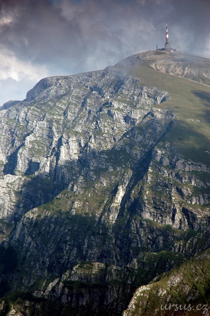 Pohled do stěn protějšího vrcholu Costila (2490m). Vysílač trochu připomínal Praděd a byl vidět opravdu zdaleka. Sledovali jsme ho už z prvního pohoří Baiului.