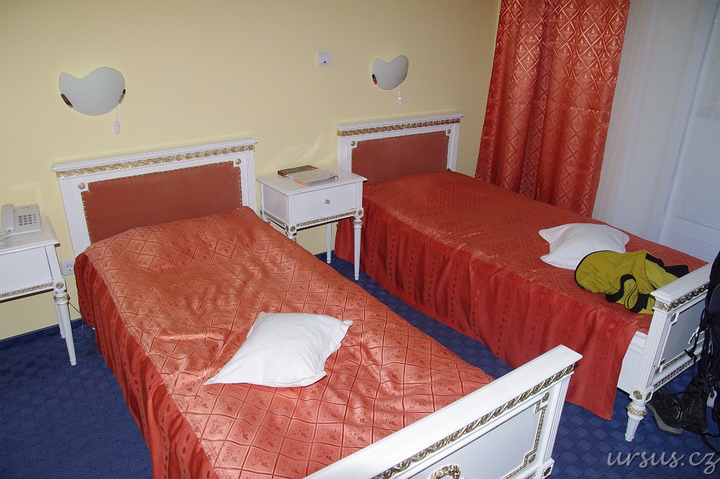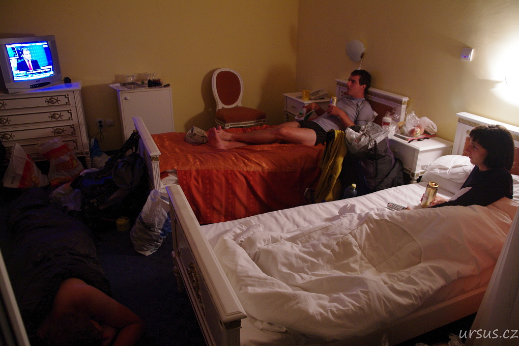 Jeli jsme nahoru klasicky nadvakrát, a ti co jeli v první várce měli opět štěstí, protože cestou nahoru viděli už podruhé za dva dny medvěda. Což byla sice supr zpráva, na druhou stranu dosti zneklidňující vzhledem k tomu že už se blížil večer, my neměli kde spát a medvědi tu očividně byli na každém kroku, což nám potvrdil i recepční v místním hotelu "Kota 1400", který doslova řekl, že medvědi tu kolem slídí skoro každý den a že spát tady venku je sebevražda...Nezbylo než na něj zatlačit a překecat ho aby nás nechal za rozumnou cenu přespat v hotelu. Na to máme naštěstí mistra Huse, vrchního ukecávače, který ve spolupráci s Aničkou vyjednal vskutnu výhodné podmínky, všechny nás narvou do jednoho dvoulůžáku a jednoho trojlůžáku. Tím pádem cena na jednoho na noc bude pěkných 180Kč (místo 500:)