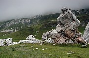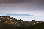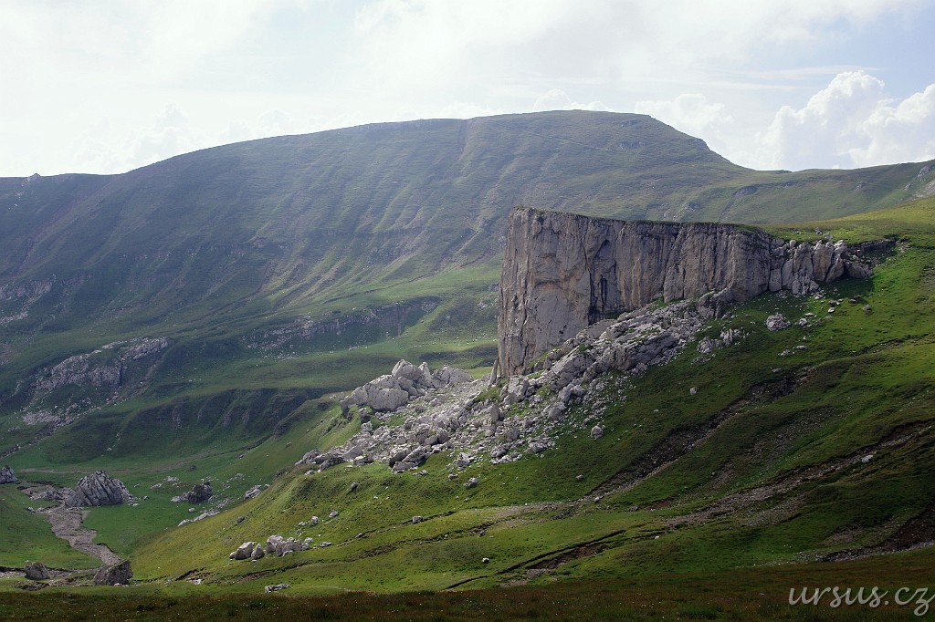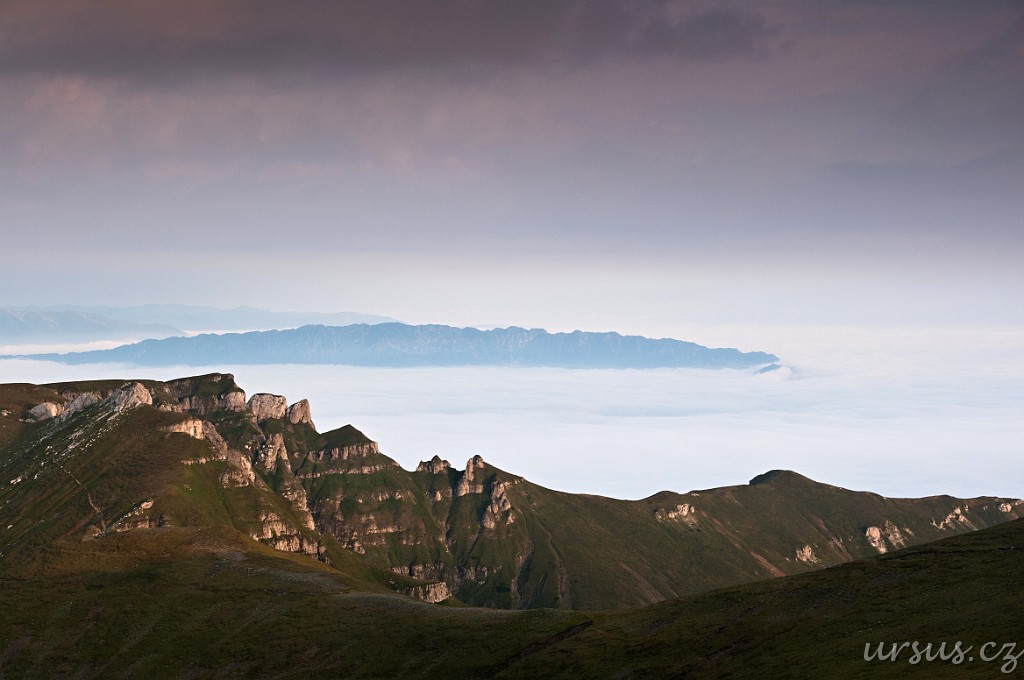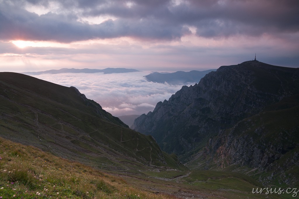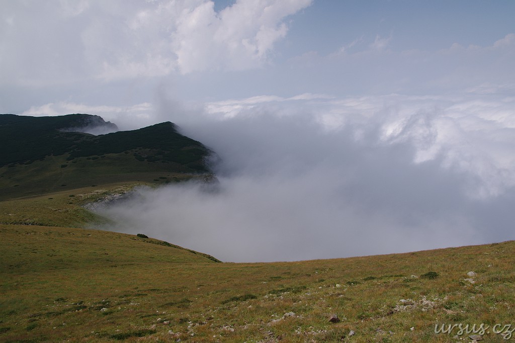 Pohoří Bucegi je celkově geomorfologicky dosti zajímavé. Jak už jsem tu vícekrát zmiňoval, jedná se o podkovu, která je z vnější strany ohraničena velmi prudkými a vysokými skalními stěnami (jak bylo často patrné na předchozích fotkách). Nad nimi se však rozprostírá naprosto nevinná a poměrně plochá náhorní rovina. Zde je krásně vidět, jak se dole pod kolmými stěnami, kde je chladněji vaří mlha a dere se stále nahoru.