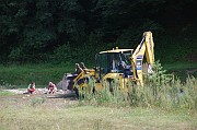 Bagr uprostřed řeky? V Rumunsku zřejmě nic neobvyklého. Na místě našeho kempu se měl za pár dní konat metalový festival (ano, přímo uprostřed krásné přírody a hlubokých lesů...) a přípravy tu probíhaly v plném proudu. Byla tu nejtěžší technika v podobě bagrů, buldozerů, velkých tatrovek a probíhalo to asi tak, že tam, kde byly nějaké malé močálky a tůňky, tam přijel bagr, a nekompromisně je zasypal. Pak se bagr vydal do řeky a začal brát štěrk přímo z koryta. Prostě pohoda:)