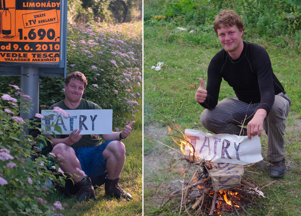 Víc jak měsíc před touto akcí fotil Hus Afroše v Olomouci u silnice jak s touto cedulí stopuje na Slovensko, a zanedlouho poté do Rumunska. Dnes jsme mohli tuto cedulku slavnostně upálit*