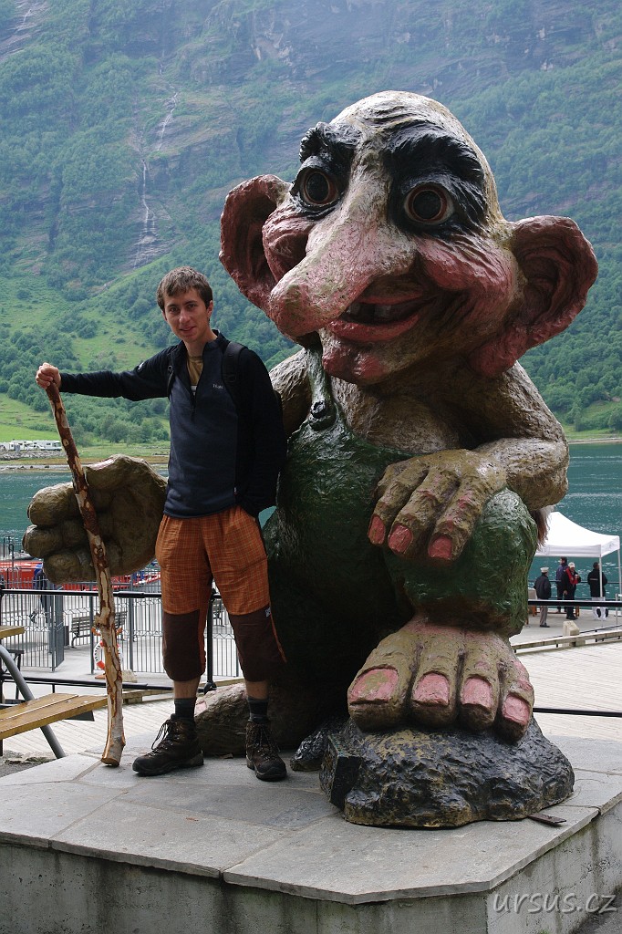 Ve městečku Geiranger se fotím s trollem a pak utíkám od komerce a byznysu do kopců nad fjordem.