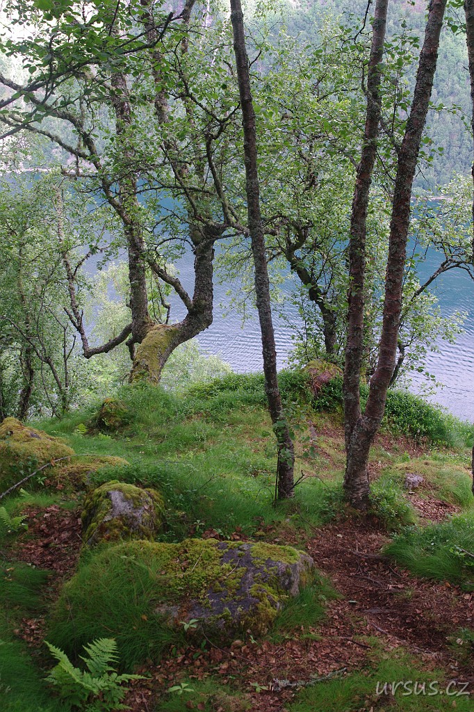 Lesem stoupám na 500m vysokou vyhlídkovou skálu Preikestolen nad fjordem.