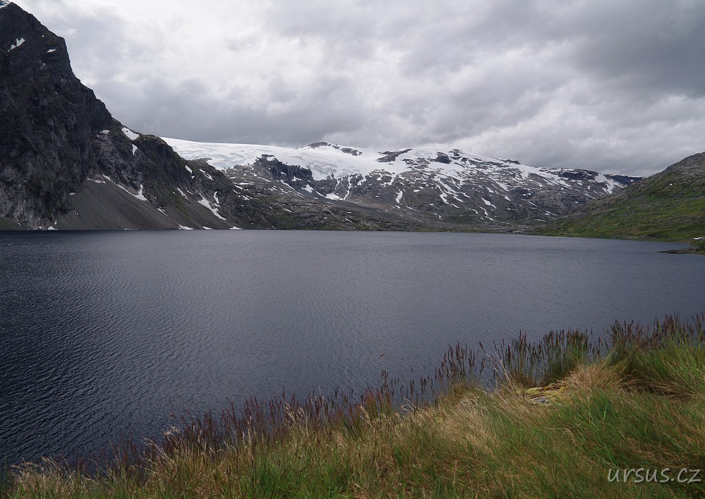 Proto stoupám vzhůru na hřeben Knutshoe a obdivuju nádherný ledovcový kar a jezero Ovre Leirungen.
