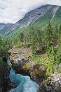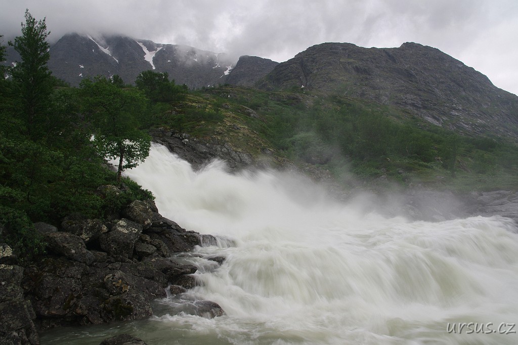 Po několika hodinách chůze po břehu jezera docházím k mohutné peřeji, kterou se do jezera Gjende valí voda z údolí Leirungsdalen. Dál již cesta podél jezera nevede.