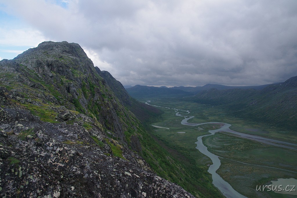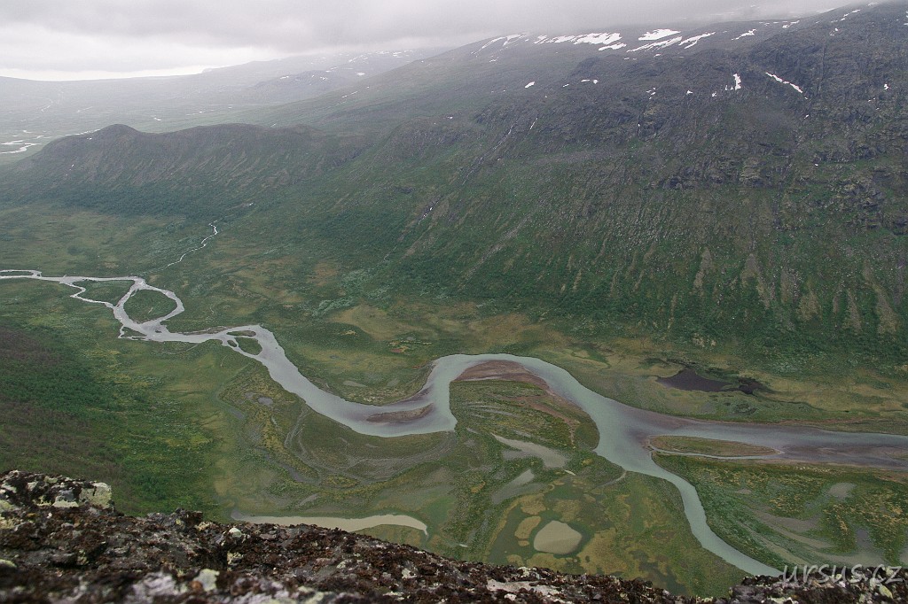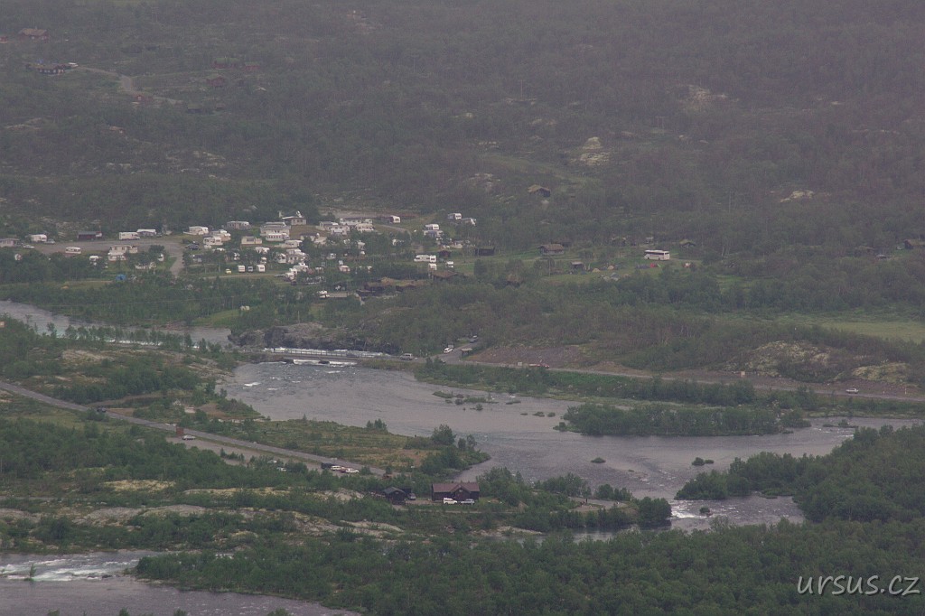 Z hřebene je krásně vidět i náš kemp a klikatící se řeka Sjoa.