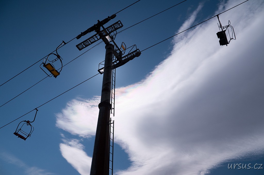 Žabljak je známé středisko jak zimní, tak letní sezóny, proto není divu, že je tu mnoho lanovek. Všimněte si barevného zabarvení oblaku vpravo od sloupu- jedná se o tzv. irizaci.