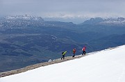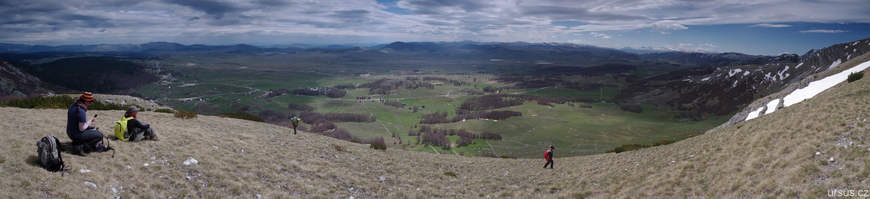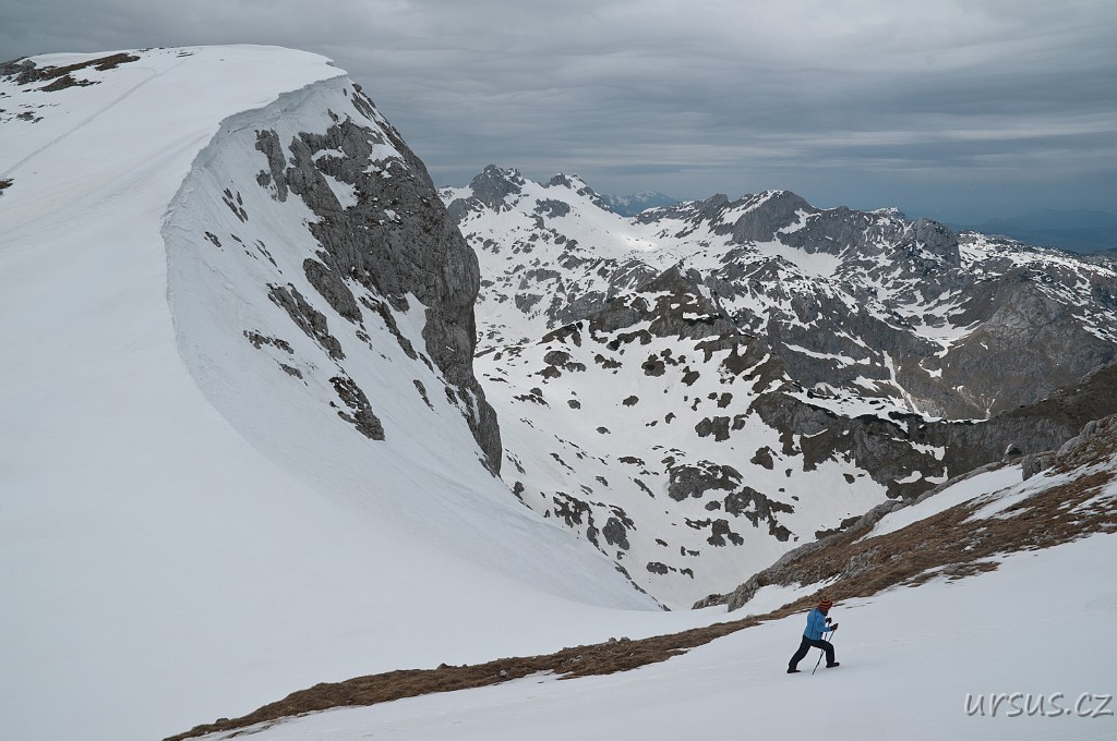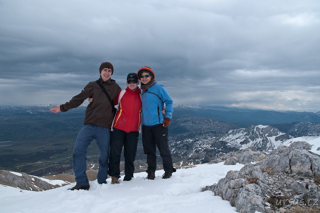 Zpoza sněhových polí vykukuje nejvyšší hora Durmitoru i celé Černé hory- Bobotov kuk (2523 m n.m.).