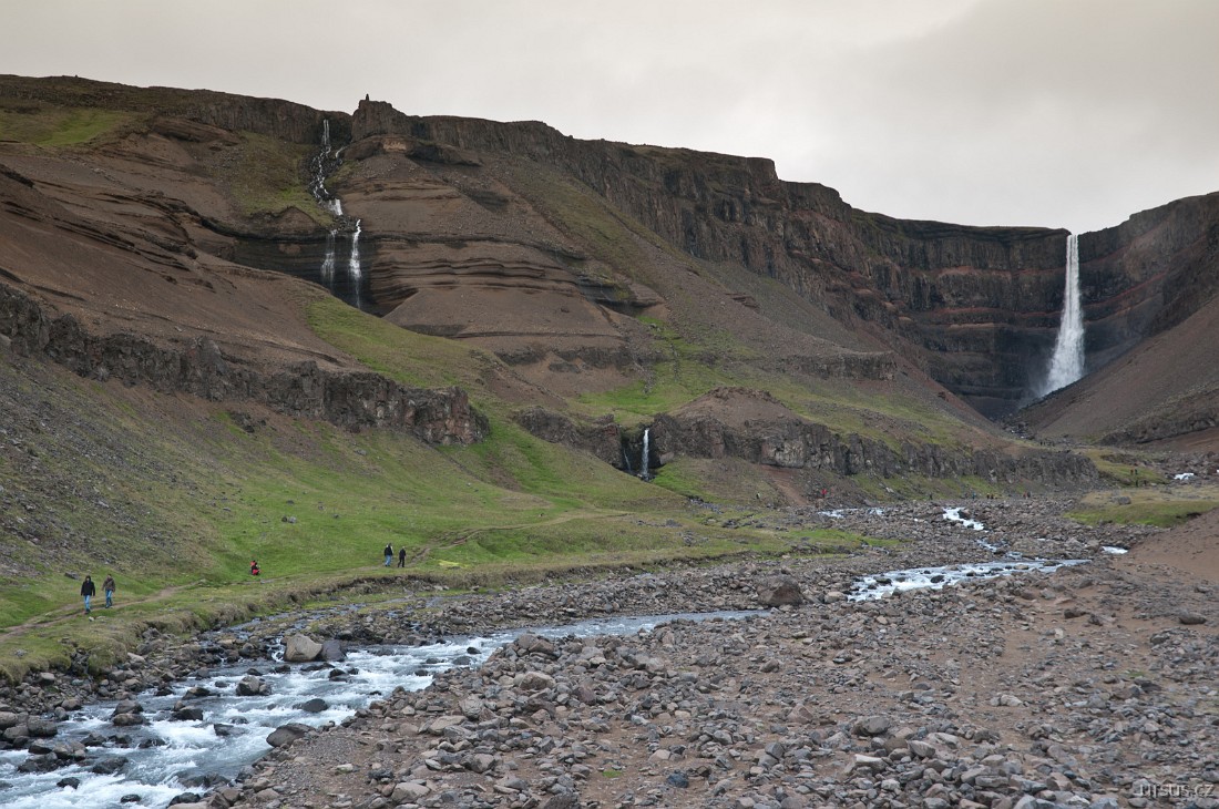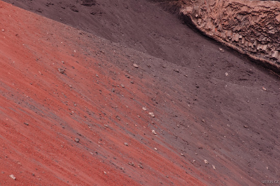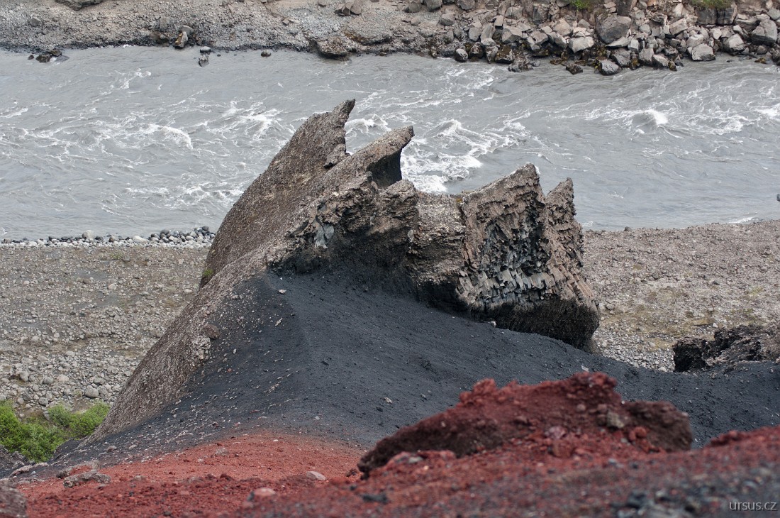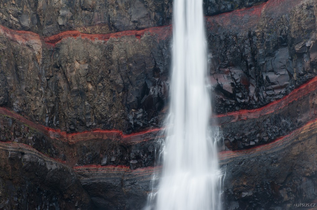 Samotný vodopád je krasavec. Tmavé čedičové vrstvy jsou proloženy sytě rudými žílami, přes které padá bělostný závoj ledovcové řeky.