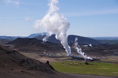 Krafla power station, elektrárna o výkonu 60MW, funguje v přímém sousedství sopky Krafla. Při předchozích erupcích byla často mimo provoz.