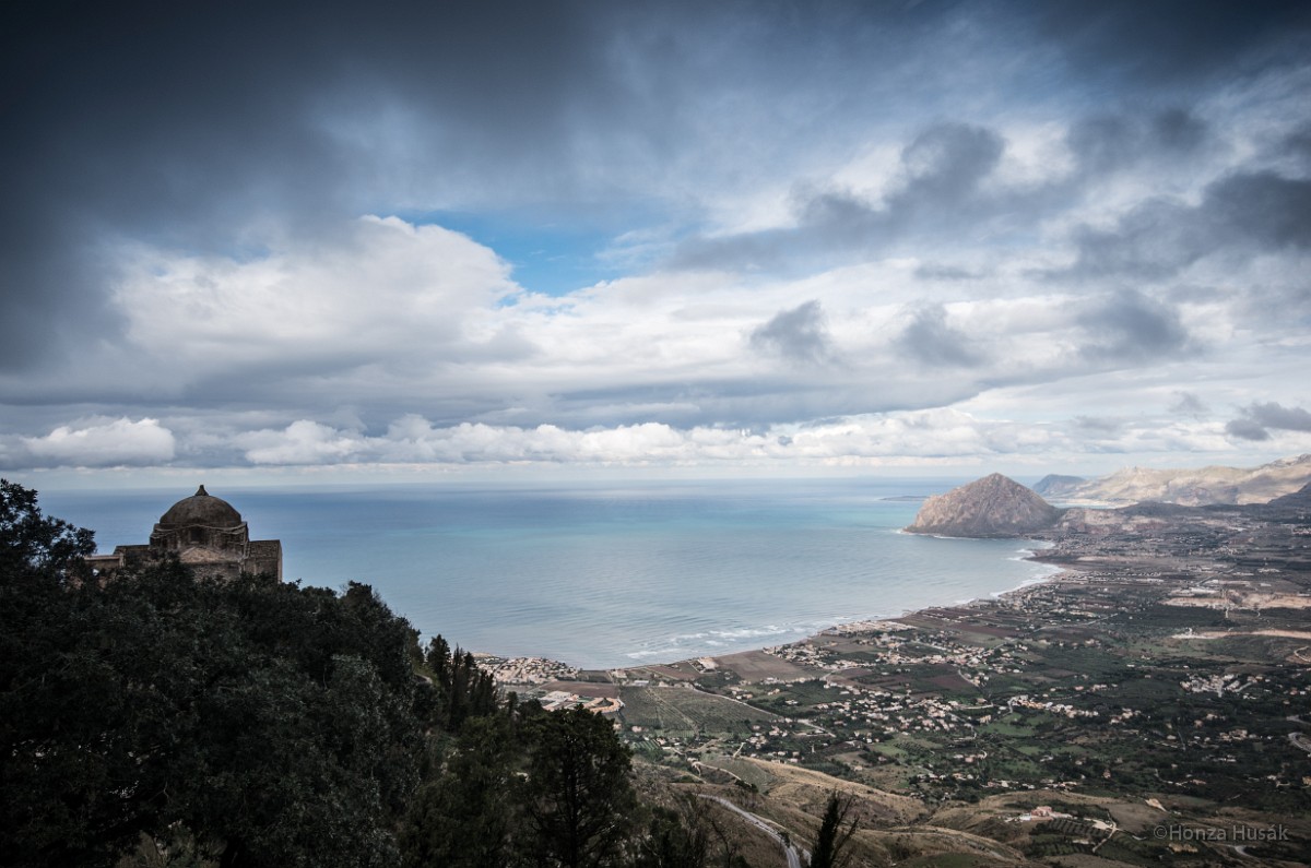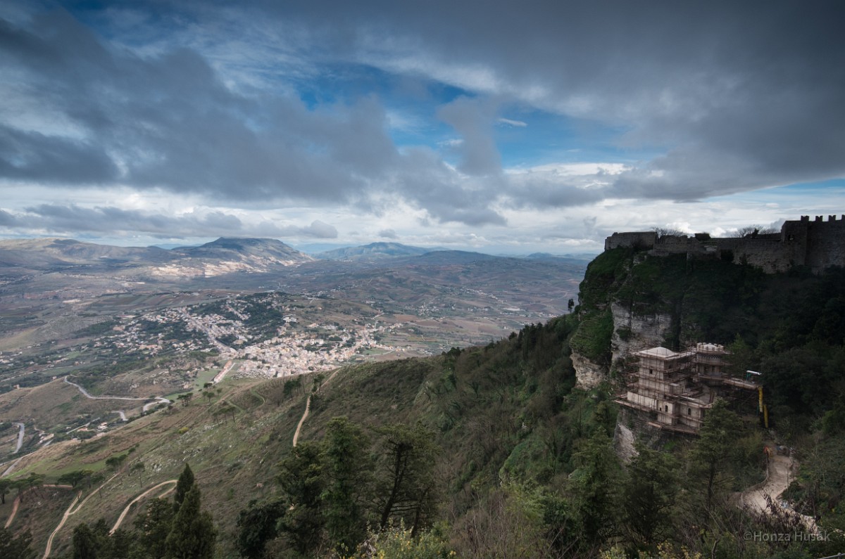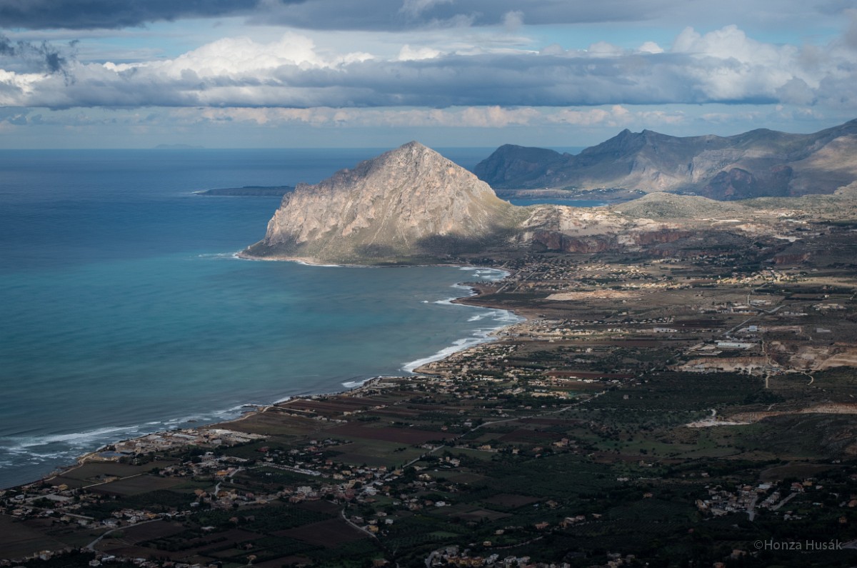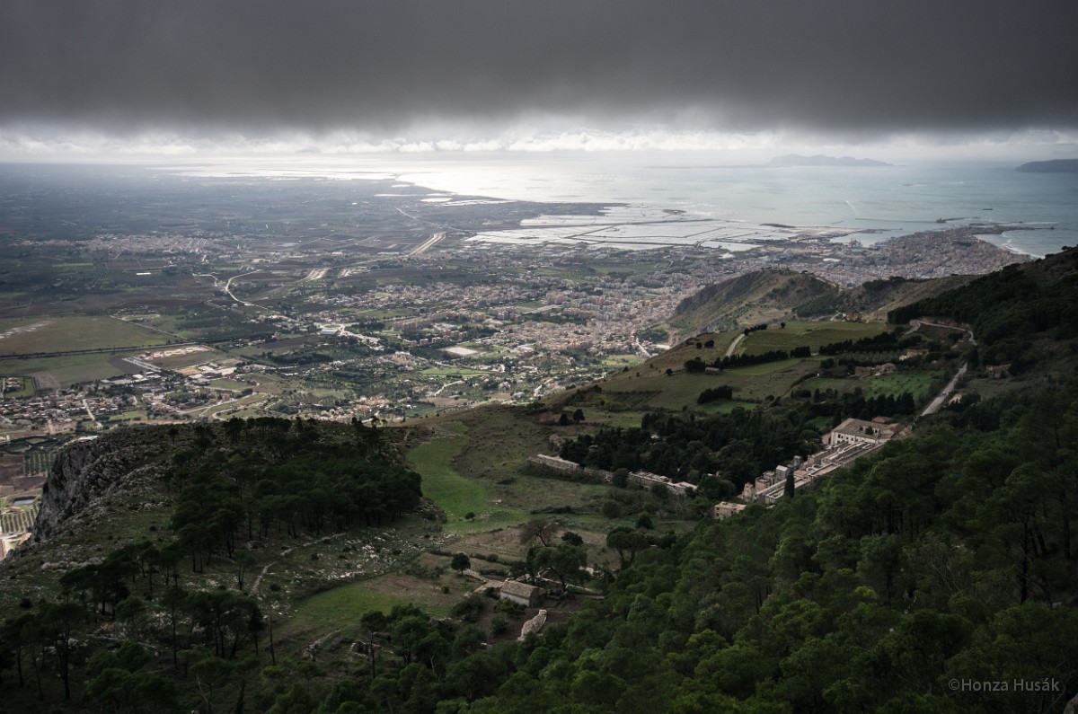 5 Naše Punto se záhy škrabe úzkými serpentinami na bájnou horu Eryx. Hluboko pod námi se rozkládá sedmdesátitisícové město Trapani, slaniska i Egadské ostrovy.