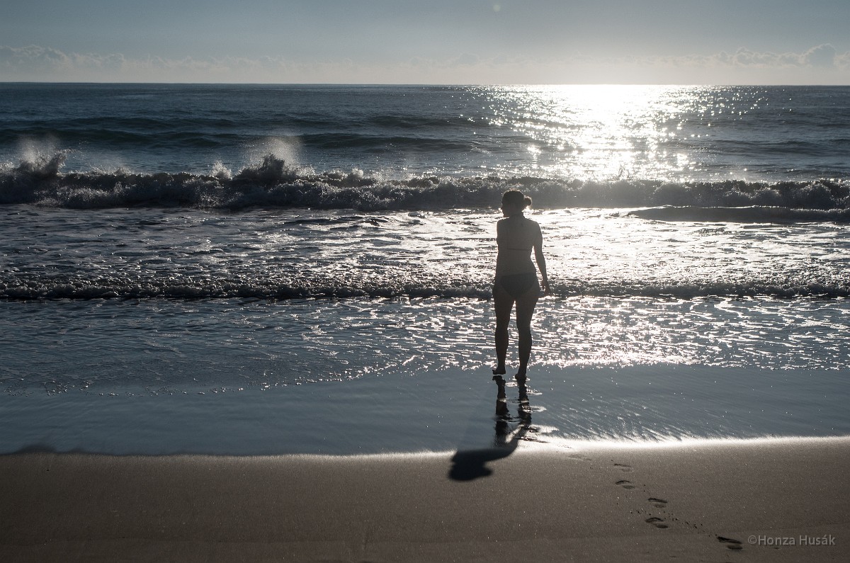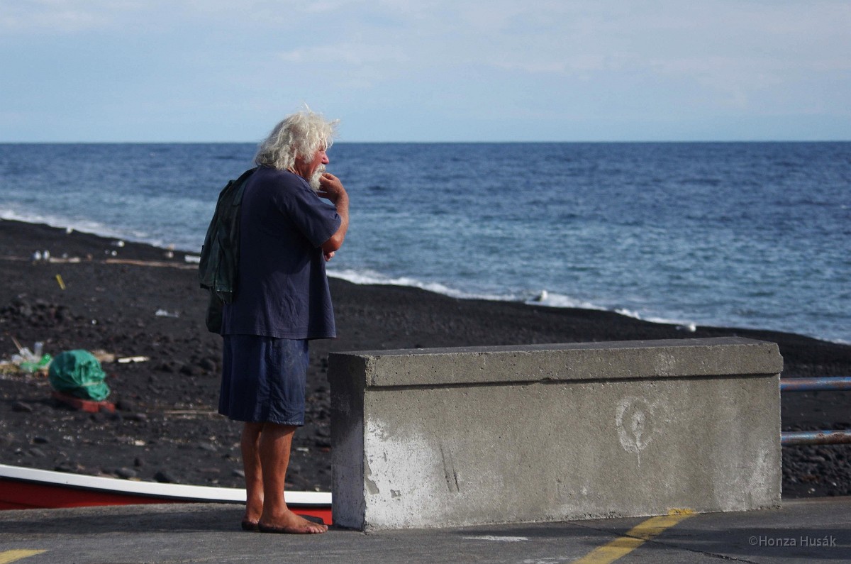 53 Vracíme se zpět k moři na černé sopečné pláže omílané mořem. Ani zde však není bezpečno -cedule varující před vlnou tsunami jsou tu na každém rohu. Poslední takováto událost se zde stala v r. 2002.