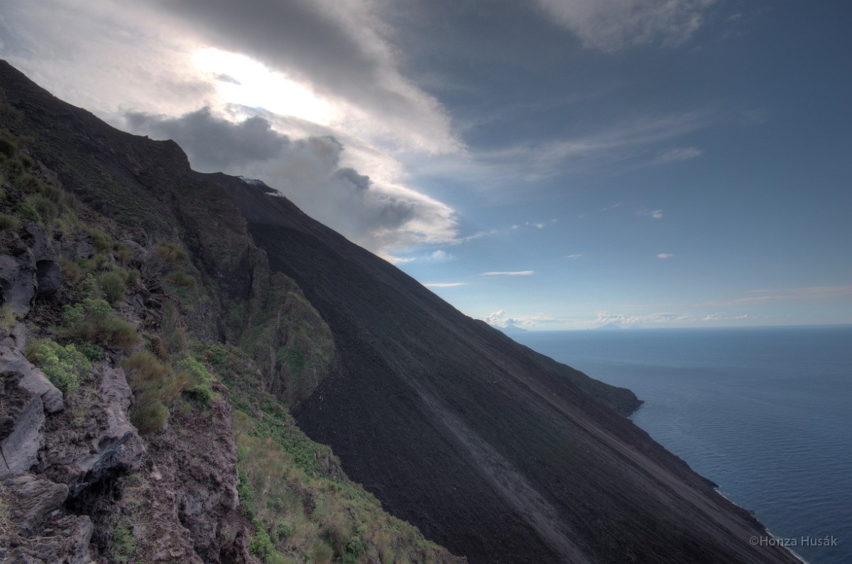46 Severozápadní úbočí sopky tvoří svah Sciara del fuoco. Vrchol hory korunuje tmavý mrak a my zjišťujeme, že je vulkanického původu.