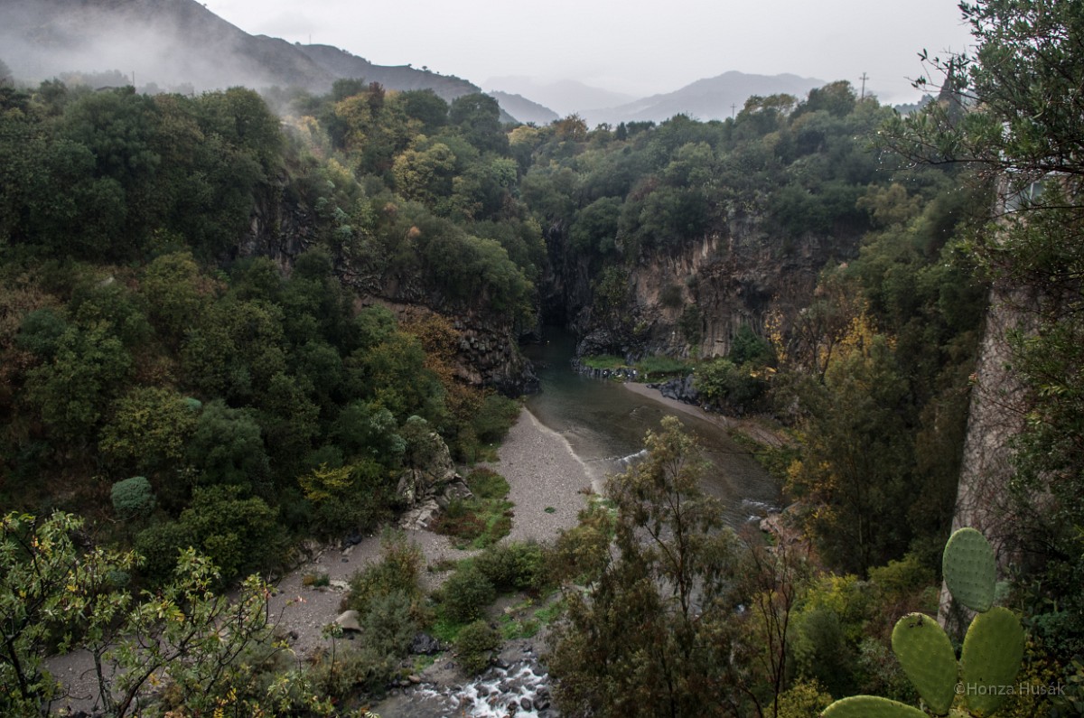 60 Další zastávka je v čedičové soutěsce Alcantara na úbočí Etny. Vzhledem ke špatnému počasí nás však do soutěsky nevpustili (stejně bylo vstupné nesmyslně přemrštěné) a tak si alespoň natruc v blízkém sadu sbíráme plnou tašku čerstvých pomerančů.