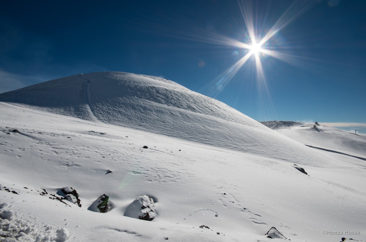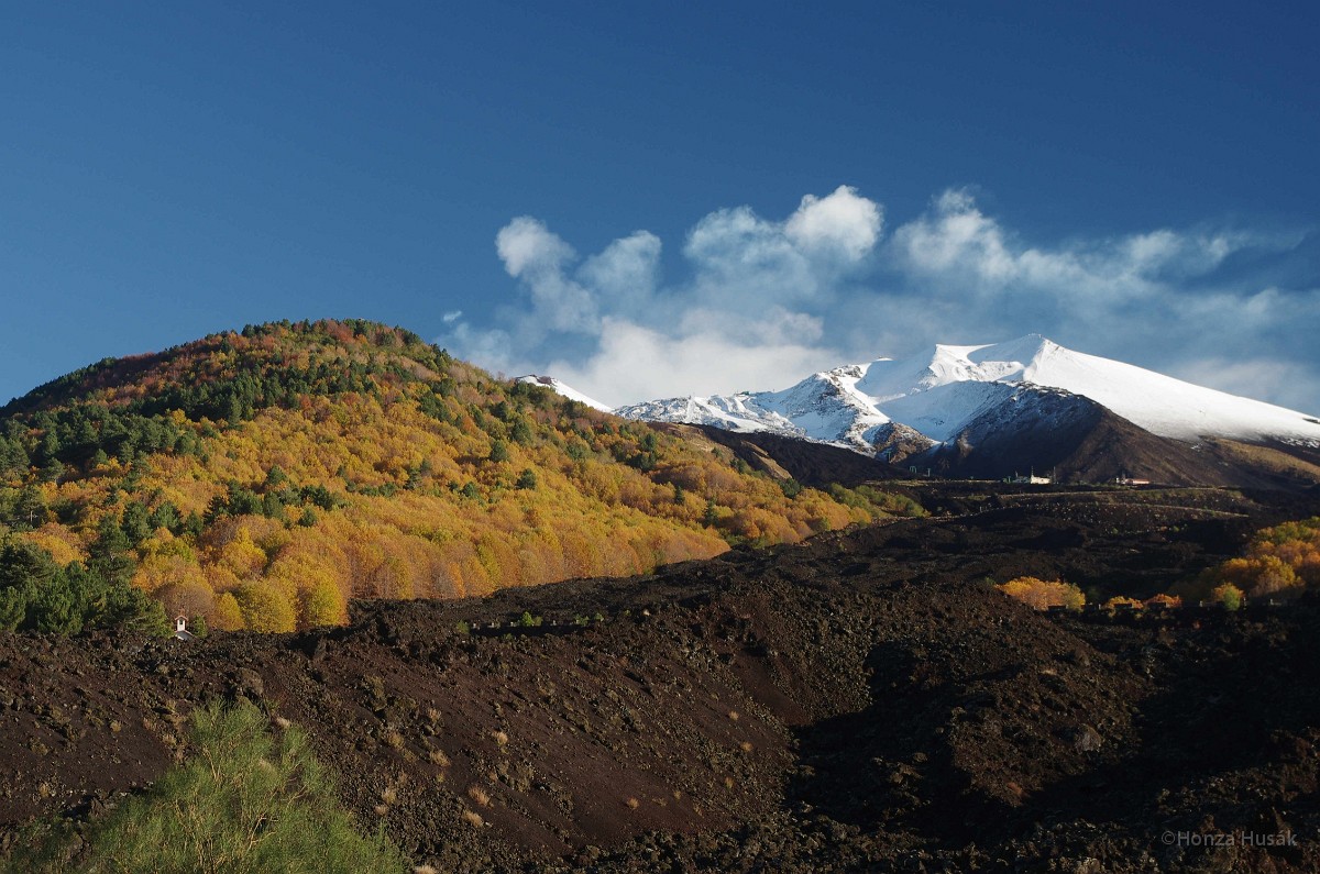 75 Pod blankytně modrou oblohou v ostrém kontrastu proti sobě stojí běloba sněhu, čerň lávy a barevné koruny podzimních stromů.