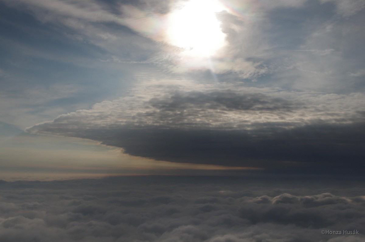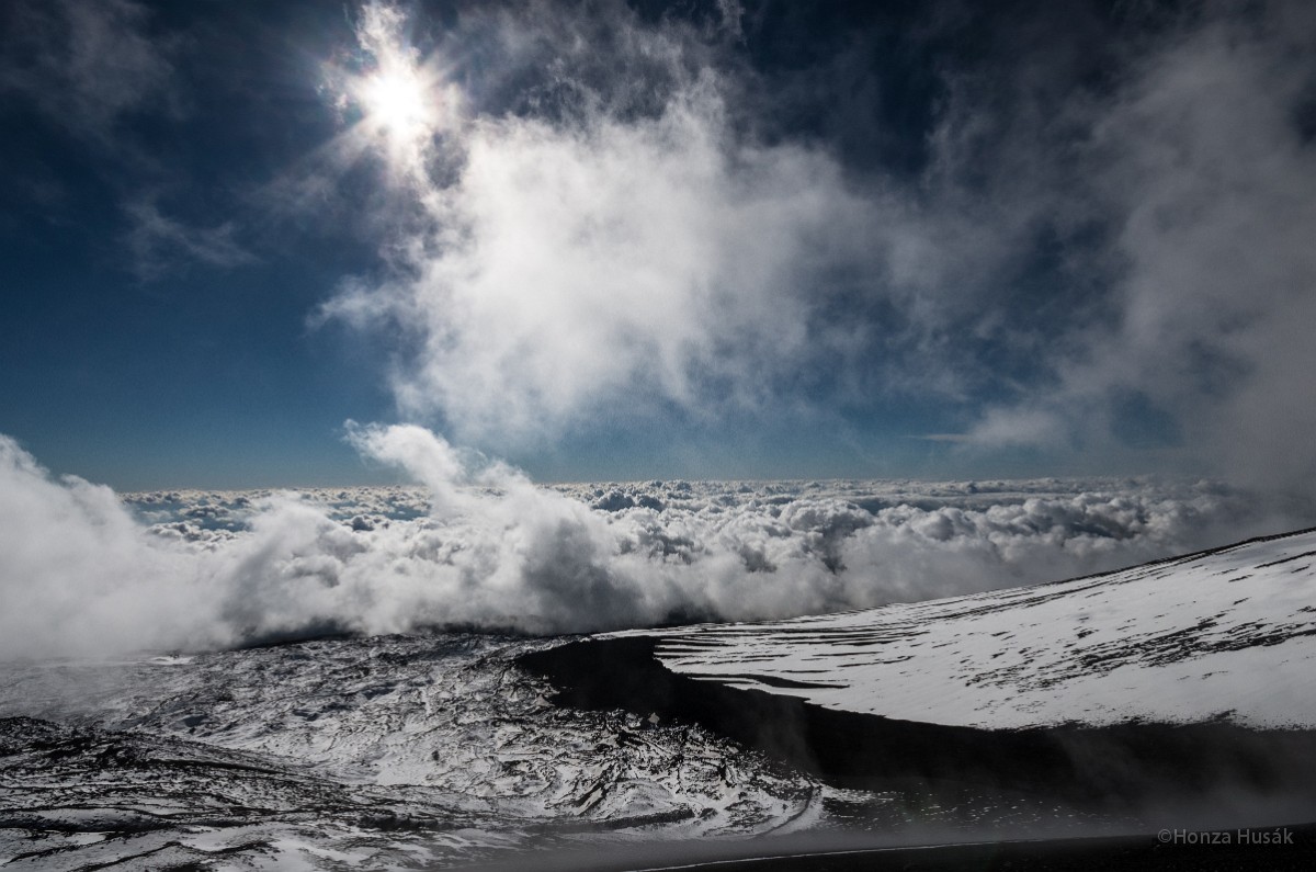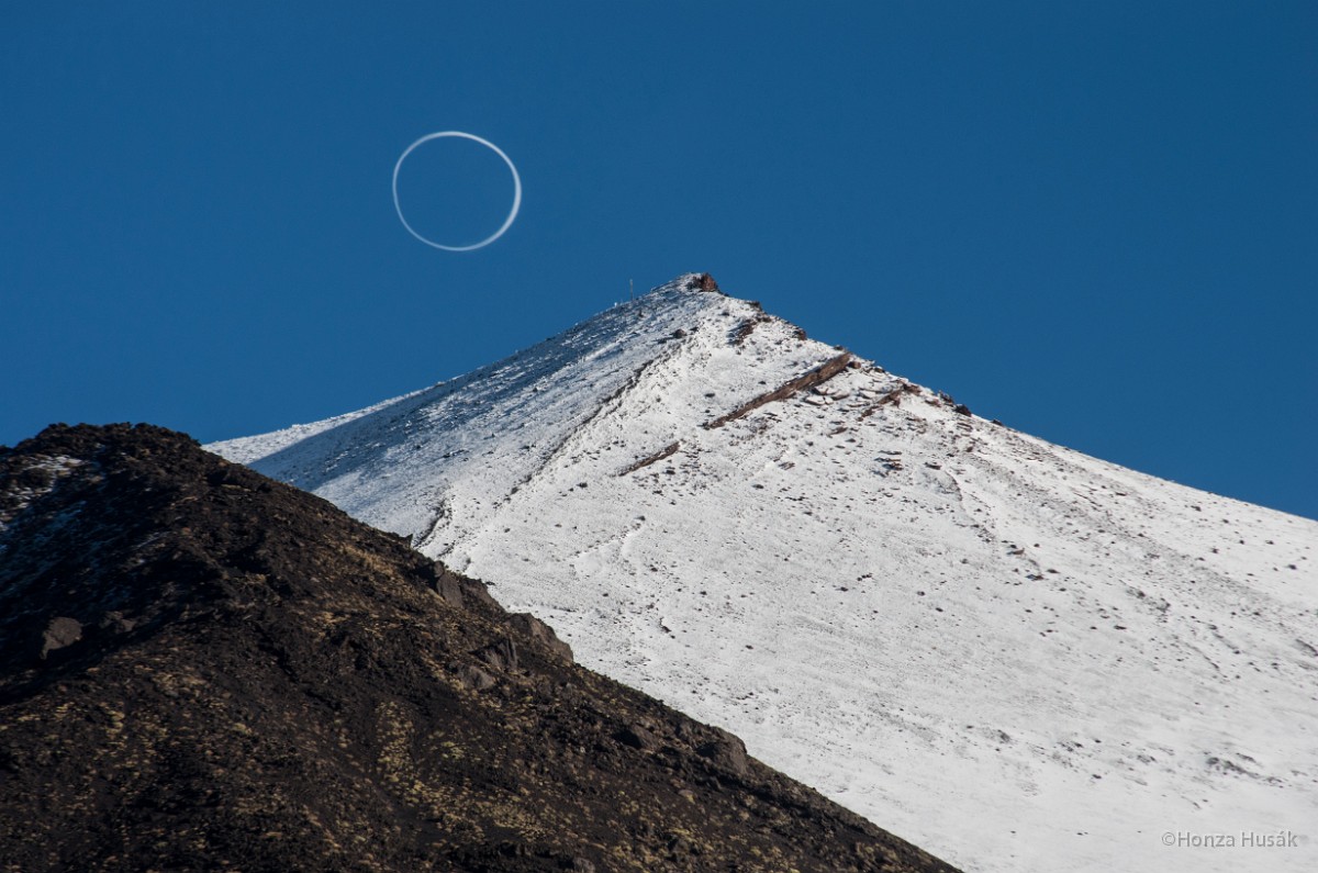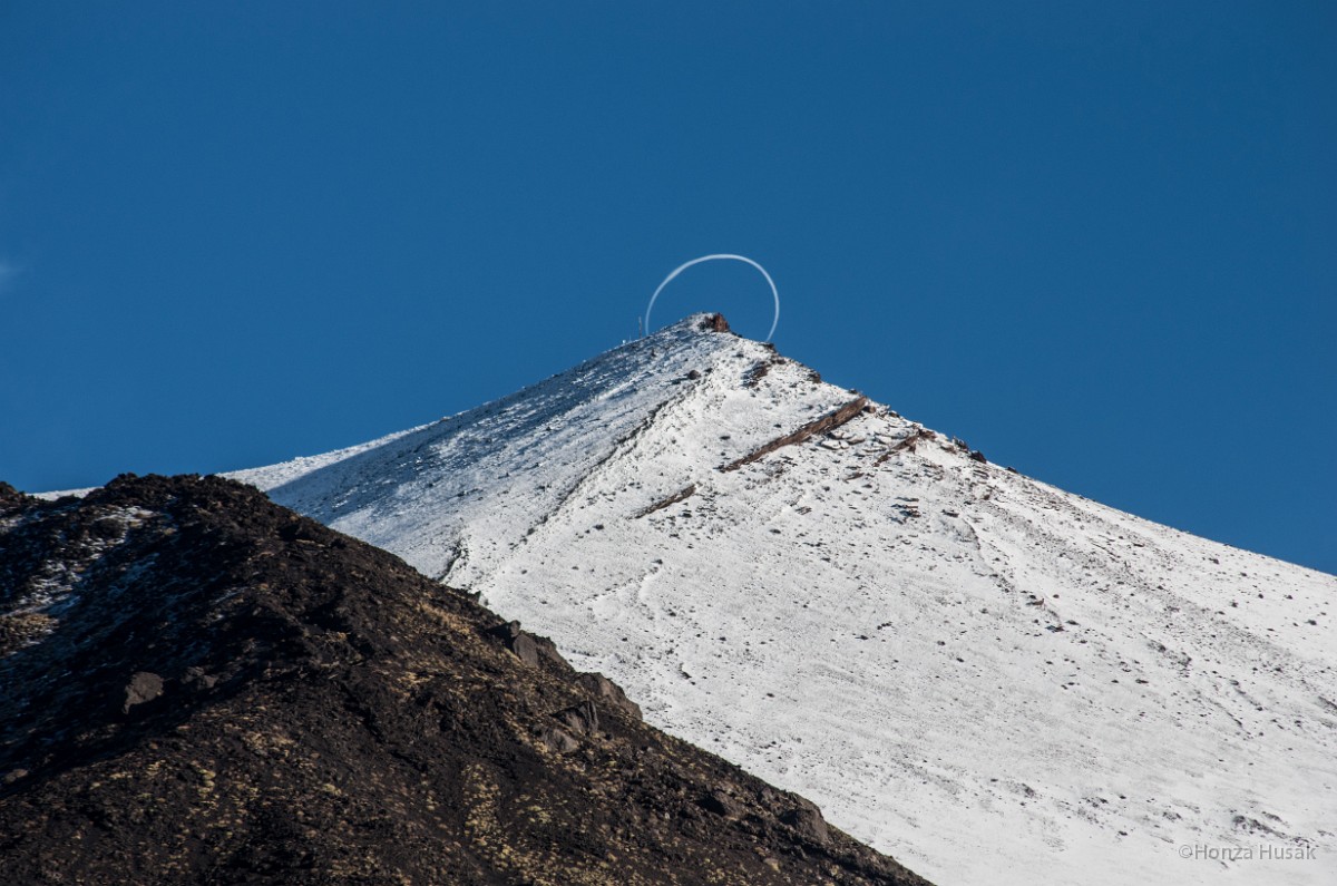 78 Během čekání na lanovku Domi zpozoruje prapodivný úkaz - nad předvrcholem Etny se objevuje oblačný kruh a vytváří tak zvláštní geometrickou kompozici. Neváhám, vybíhám na parkoviště a fotím ostošest.