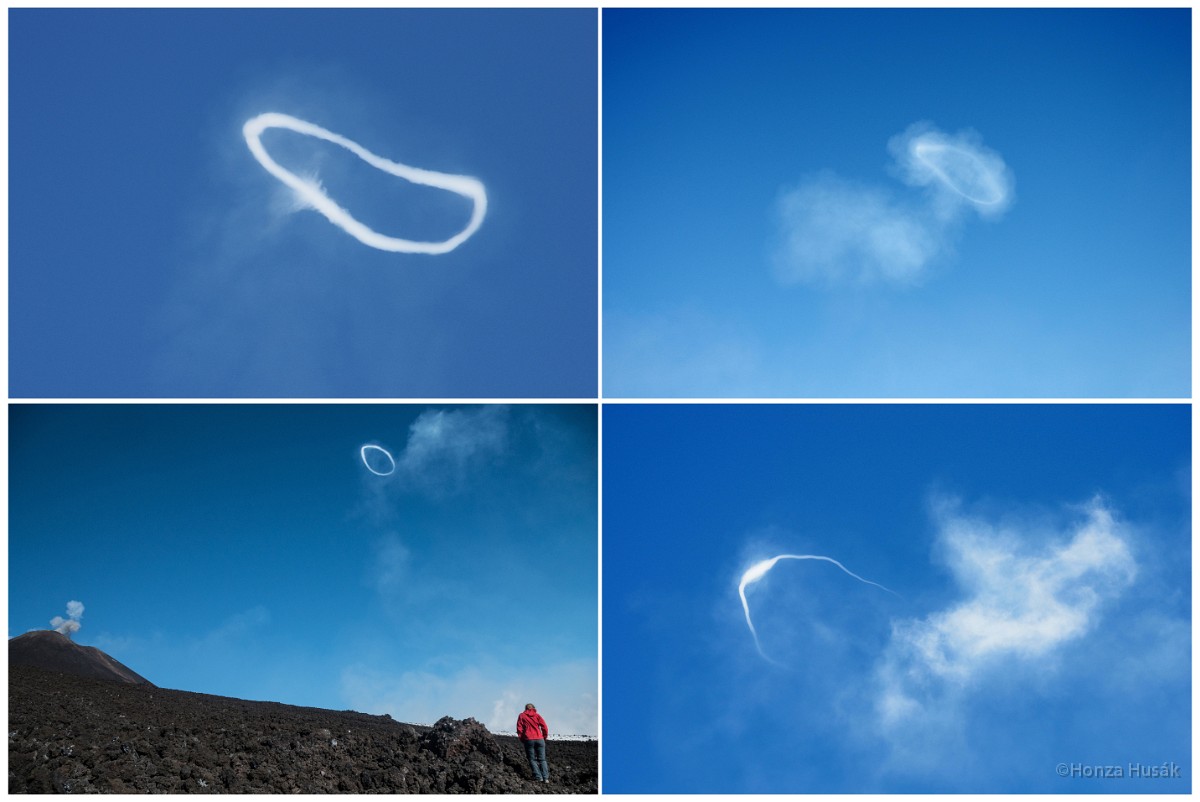 87 Etna k nebi znova vysílá i kouřové prstence. Vznikají zřejmě tak, že pára pod tlakem proniká kruhovitě tvarovaným otvorem sopky. Jedná se opravdu o vzácnost, naposledy pozorovanou v roce 2000 a pak v r. 1970.