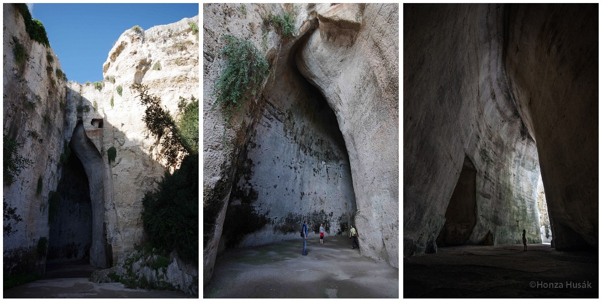 103 Slavná uměle vyhloubená jeskyně "Dionýsovo ucho" je 60 m dlouhá a 23 m vysoká. Říká se, že ji nechal vyhloubit tyran Dionýsius jako věznici a díky skvělé akustice mohl slyšet, co si vězni povídají. Akustika je fakt skvělá, můžeme potvrdit.