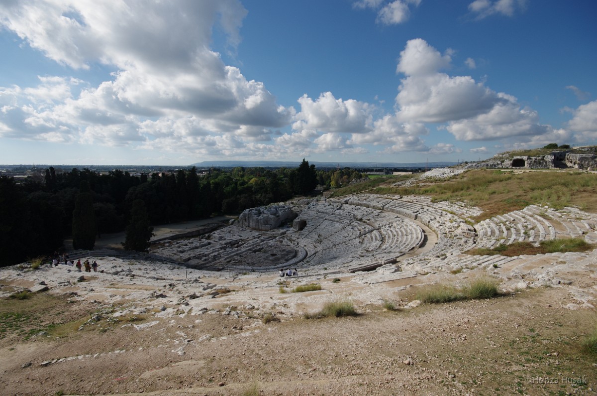 104 Nejimpozantnější památkou Syrakus je řecké divadlo. Se stavbou se začalo v 5. stol.př.n.l., ale kompletně bylo divadlo dostavěno v letech 238 – 215 př.n.l. Sedadla jsou vysekána do skály. Kapacita hlediště je 16 000 diváků. Za římské nadvlády bylo divadlo uzpůsobeno i k námořním hrám.