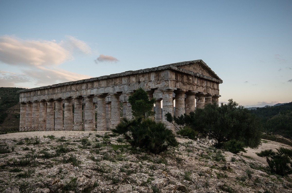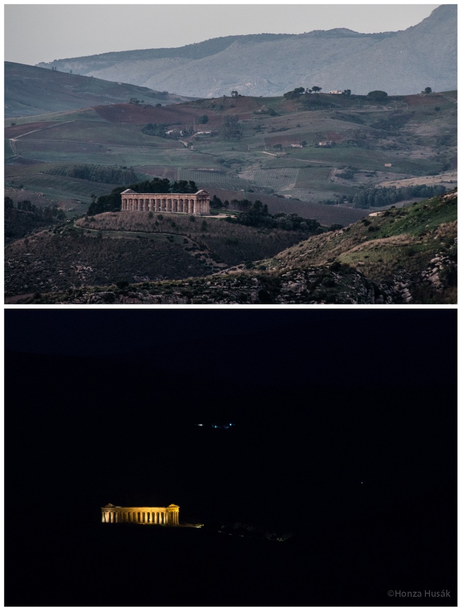 118 Pohled na chrám z kopce nad Segestou za soumraku a v noci.