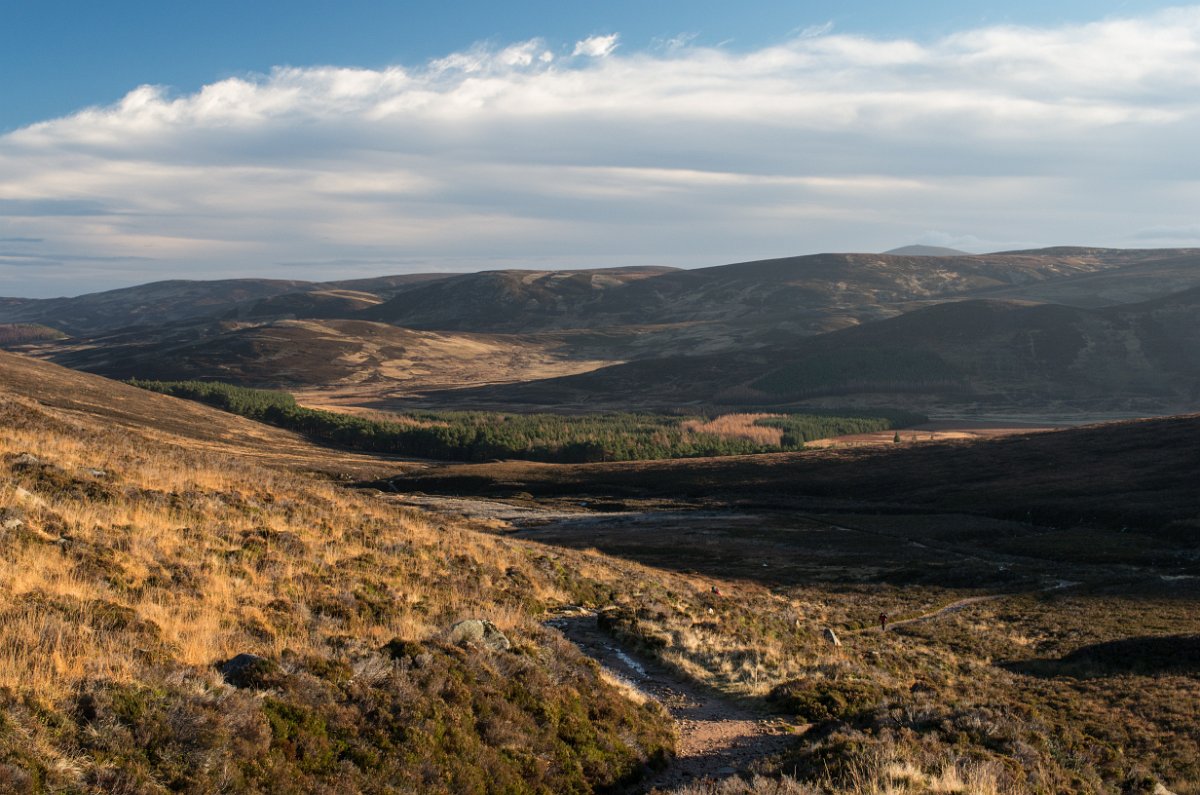 5 Údolí Glen Muick zalévá sluneční záře a já vzpomínám na výlet na horu Mount Keen (na obzoru), který jsem absolvoval už téměř před dvěma měsíci.