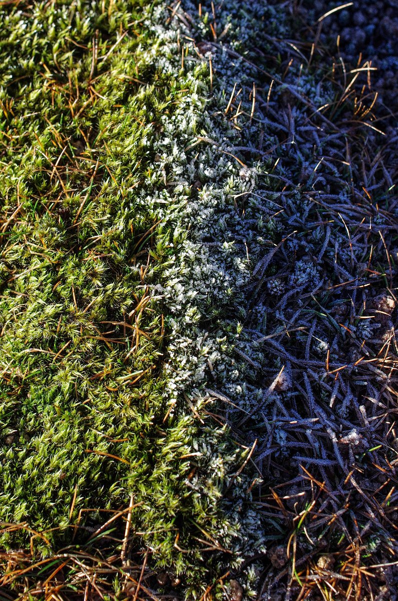 15 Fyzika i klimatologie v praxi: jižní, sluncem ozářená strana mechu přijímá mnohem více tepla a proto taje. Na severní straně však mrzne.