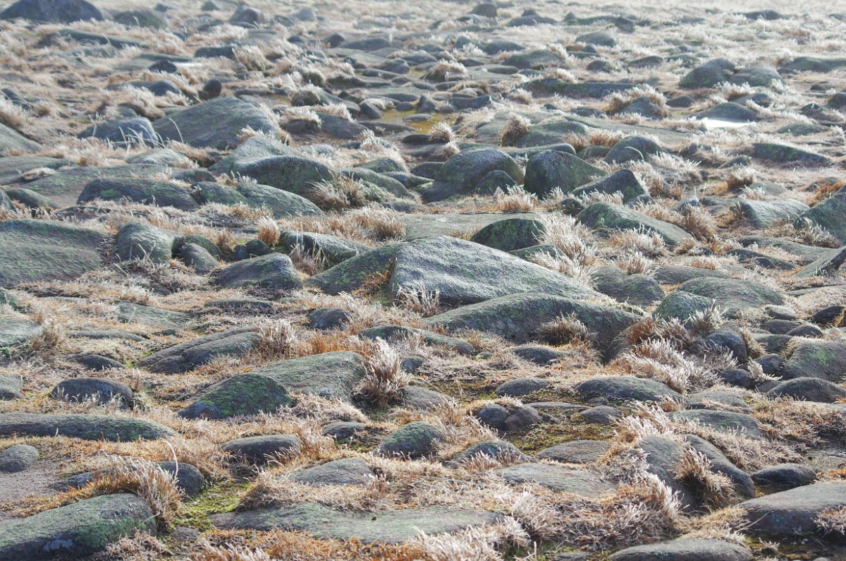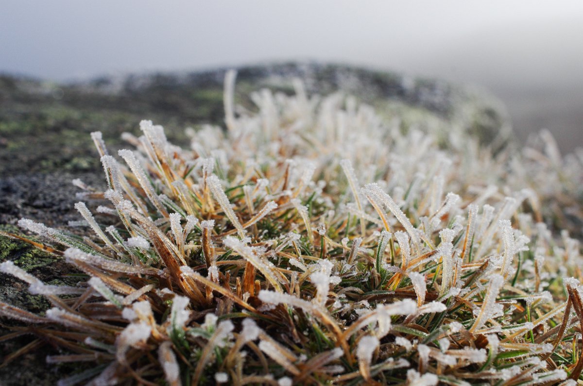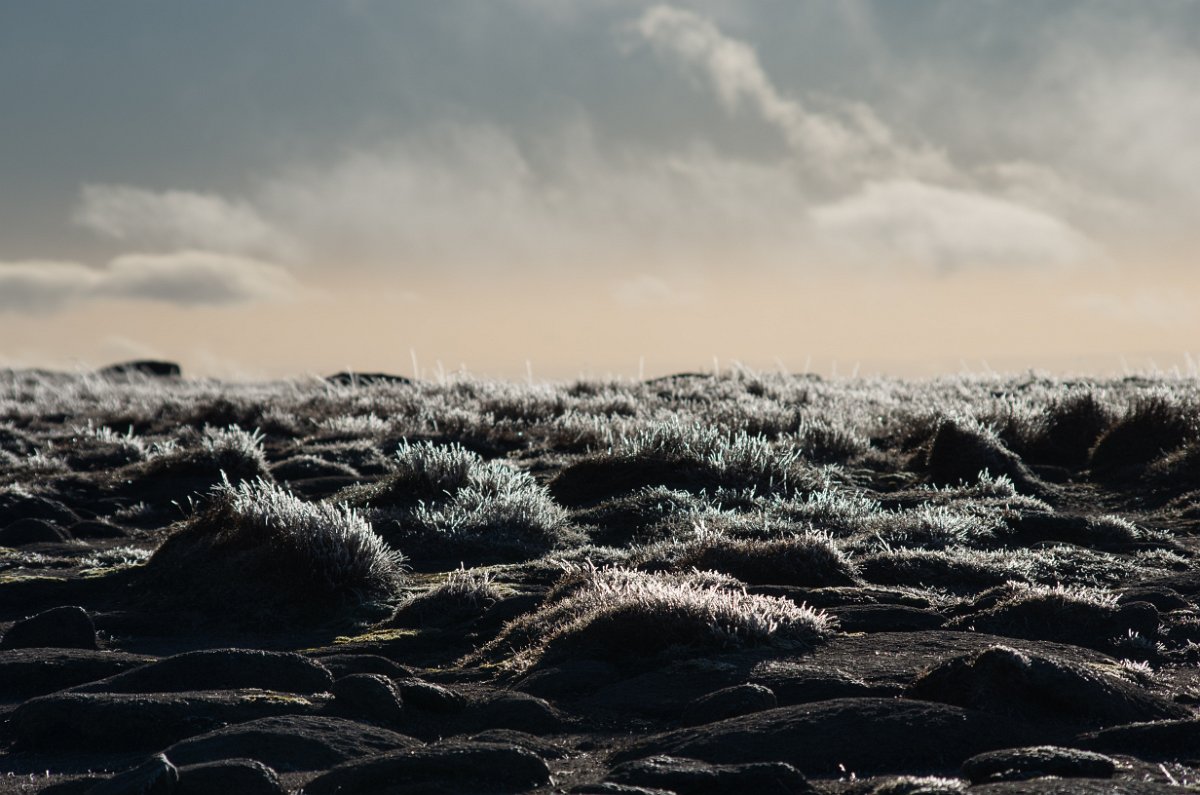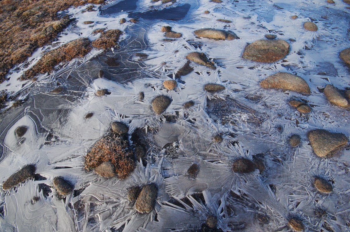 16 Slunce zčásti zakryté mraky a ledová námraza na zemi kouzlí úžasné barvy a tvary.