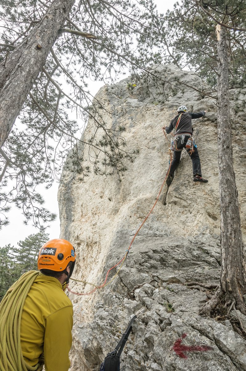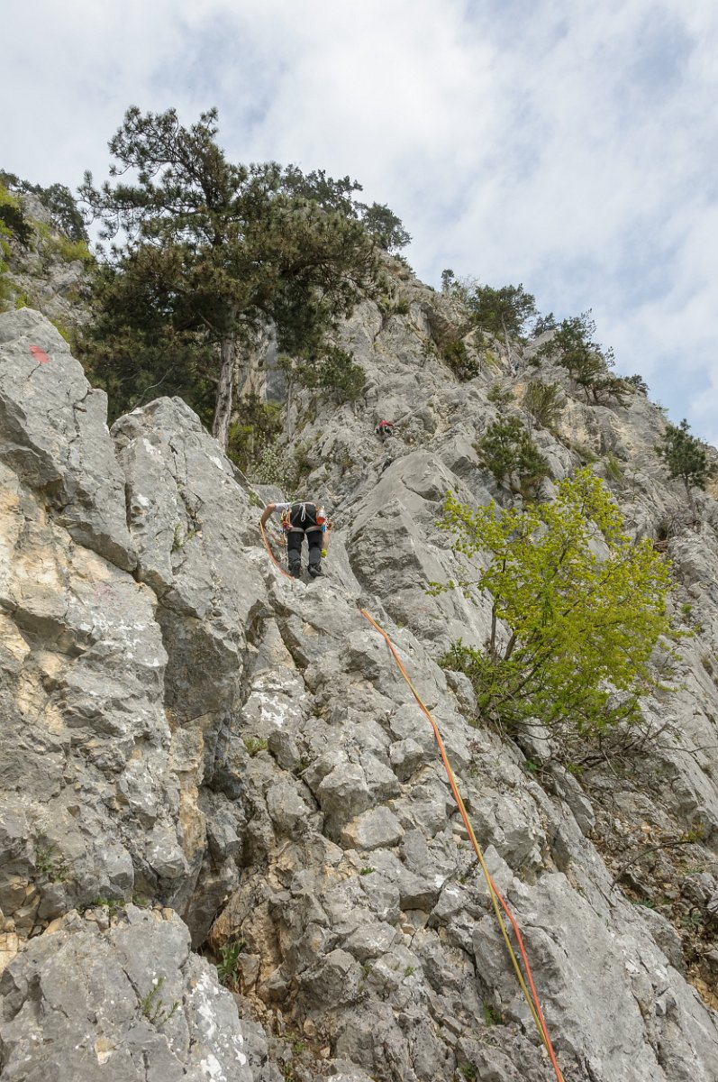 14 Nejtěžší část byla až v úplném závěru. Vyhazující spárka. Obtížnost zhruba 6. Ale byl to jen takový 10m bonbónek v úplném závěru, který šel navíc obejít chodeckým terénem, pokud by si na to někdo netroufal. Celkové hodnocení cesty - na úvod dobrá, ale obtížnostně nic extra, občas víc turistika než lezení:)