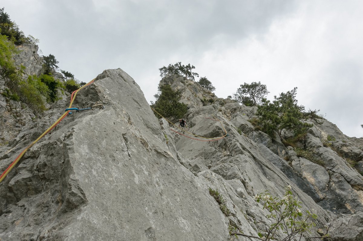 50 No ten sedmičkový úsek (traverzující spára, nohy na kluzáka), jsem nějak přebrousil a vydal se do předposlední šestkové délky. Teď už samozřejmě nelezeme cestu Smoky Joki, ale pokračujeme volně cestou Sonnenuhr pfeiler (7). Vápno krásně drží, lezení je tady fakt skvělé!