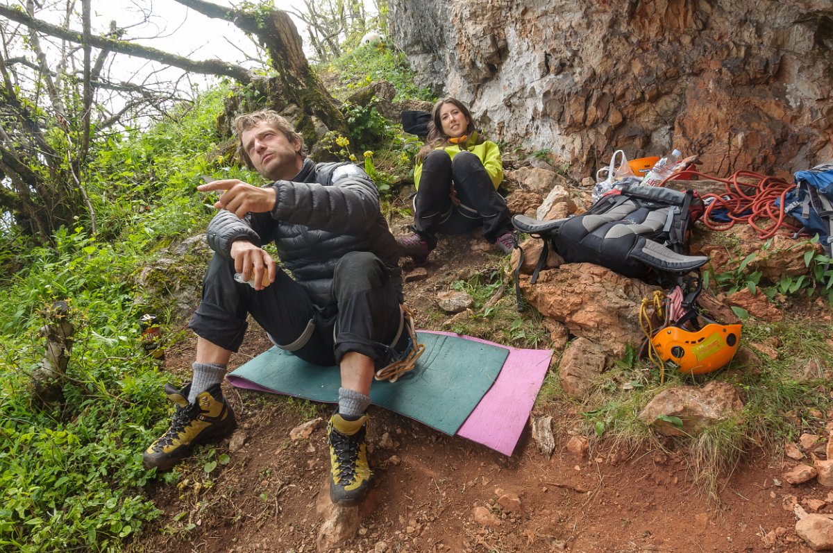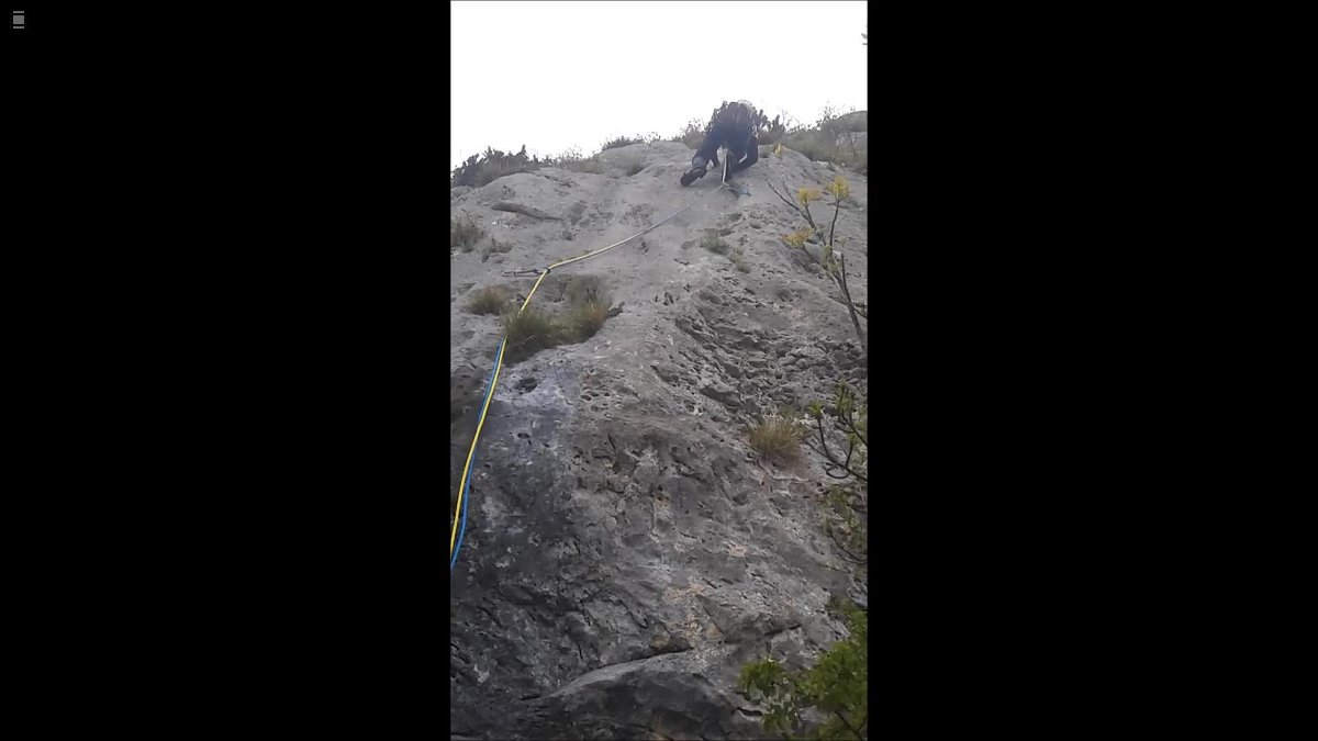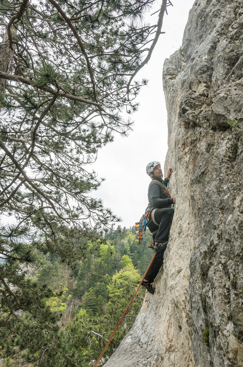 48 Máme za sebou pěknou šestkovou délku. S báglama na zádech dá i tato obtížnost slušně zabrat. Miguel by měl nyní traverzovat doleva, to se mu ale nezdá, a tak pokračuje rovně. Tam ale naráží na sedmičkové lezení a to se mu taky nezdá, tak zase couvá a předává mi štafetový kolík.