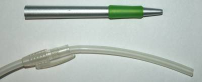 2) Horní částí rozmontované průpisky prostrčit hadičku. Hadička má průměr o málo větší než otvor, proto bude dobře těsnit.