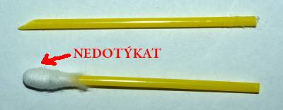 4) Upravit 2 vatové tyčinky. Ostrý hrot: je třeba oba konce očistit od vaty, jeden konec seříznout do špičky. Měkký hrot: jeden konec od vaty očistěte, druhý ponechejte. Ale pozor, NEDOTÝKAT se vatového konce!- lidské ruce jsou mastné a vatu je třeba zachovat sterilní.