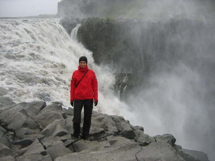 Vodoodpudivá úprava DWR hravě zvládne mrholení nebo krátkodobý deštík, s tím dlouhodobějším a vytrvalým si však neporadí. Island, vodopád Dettifoss.