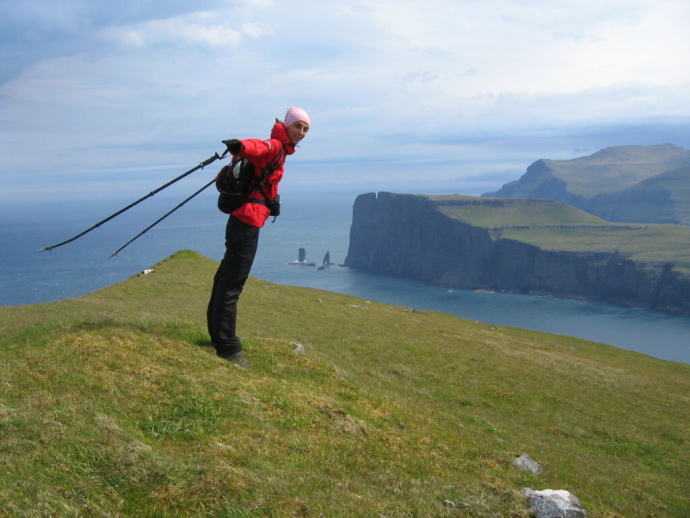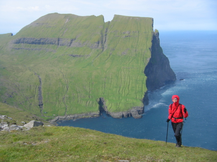 Kalhoty odolávají větru, který zde dosahoval rychlosti až 150 km/h. Faerské ostrovy.