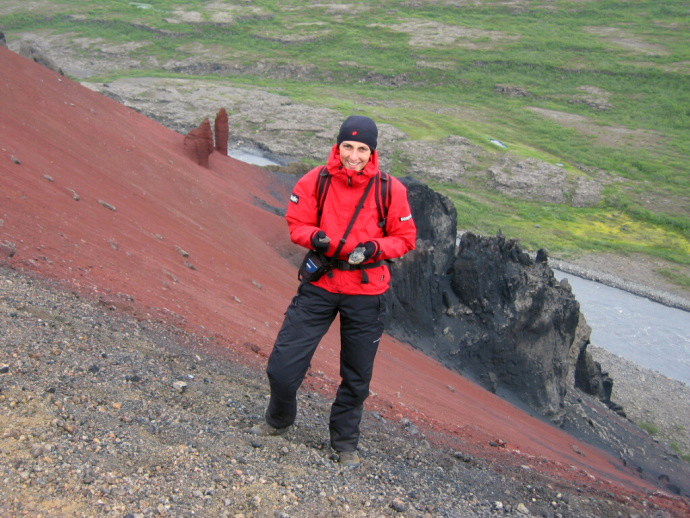 Kalhoty mají zdvojenou látku na nejvíce namáhaných místech. Island, sopka Raudholar.